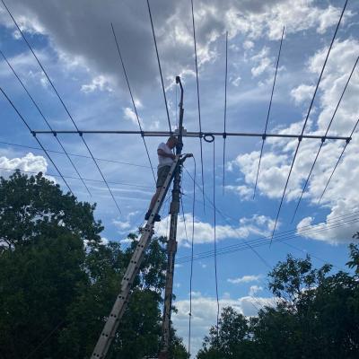 HA8TA: A következő hét a YOTA verseny volt, ez már a 24 órához képest laza 12 volt HI. Jó lehetőség lett volna 8CK Attilának versenyezni, de mivel nyaraltak így kölcsönadta a végfokját és én indultam el. Itt már nagyobb teljesítménnyel szabadon lehetett CQ-zni SSB-ben is. Ez a verseny is jól sikerült szintén kijöttek a kérelmezett pontszámok a kategóriámban 3 Bands-YOTA (40M, 20M, 15M) jó eredményt sikerült elérni, de mivel nagyon szoros a verseny, így nagyon képlékeny, hogy mi fog történni. Az ezt követő hétvégén volt a IOTA verseny melyen 8CK Attila indult volna a megbeszéltek szerint, ha sajnos az időjárás nem avatkozik közbe. Épp kint voltam a tanyán mikor kinéztem az ablakon, hogy mennyire mozgatja a szél az antennát, mikor egy antennaelemet megpillantottam a szemem sarkából, aminek nem ott lett volna a helye. Egyből kiszaladtam és sajnos szomorúan kellett szembesülnöm a látvánnyal. A TA-19 felső 2 tagja az antennával együtt lógott lefelé amit a benne lévő drótkötél tartott. Azonnal telefonáltam Csabának, aki megnyugtatott, majd felhívta Baranyi Tibit HA8BAR, hogy ha tud jöjjön ki segíteni menteni ami menthető. 2 földbeálló 14MHz-es tagot leszereltünk hogy ne feszüljön így stabilizáltuk. Az antennát és a forgatót antennát nagyobb kár nem érte. A leszerelés sajnos ezután következik.